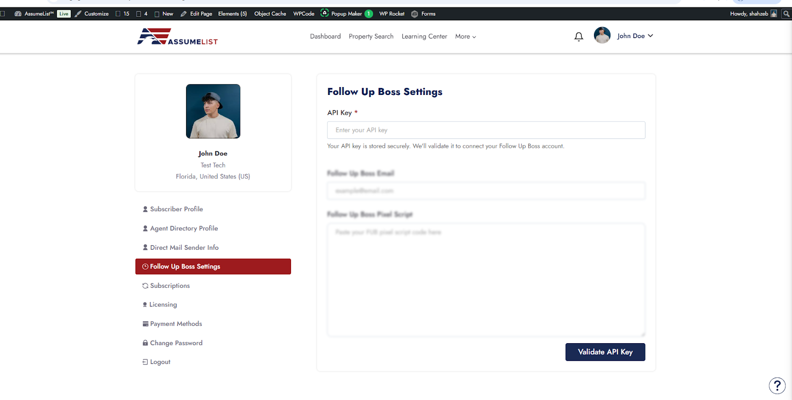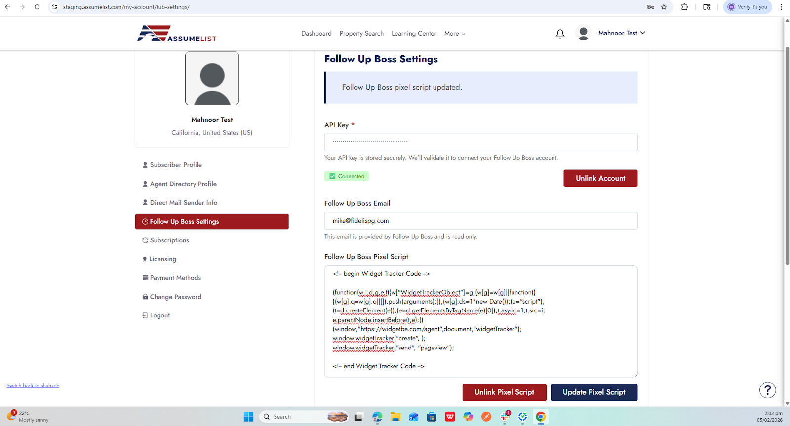 The API key securely links AssumeList and FUB, allowing:
