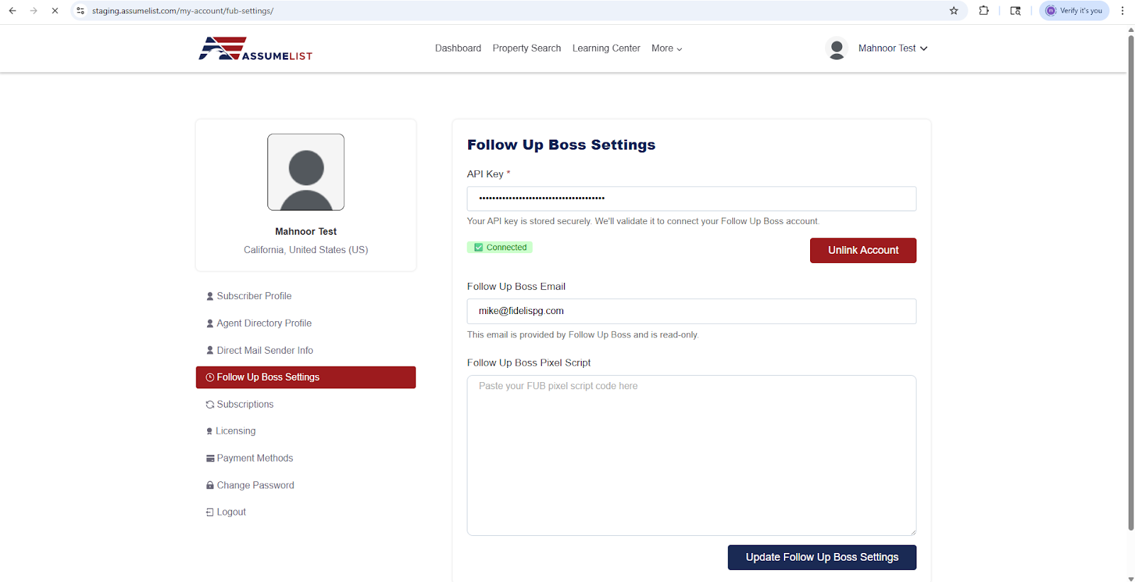 This guide explains how to link your AssumeList account with your Follow Up Boss (FUB) account so your data, activity, and subaccount insights stay connected.